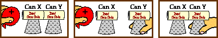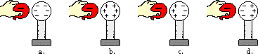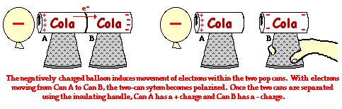 This induction charging process can be used to charge a pair of pop cans. It is a simple enough experiment to be repeated at home. Two pop cans are mounted on Styrofoam cups using scotch tape. The cans are placed side-by-side and a negatively charged rubber balloon (having been rubbed with animal fur) is brought near to one of the cans. The presence of the negative charge near a can induces electron movement from Can A to Can B (see diagram). Once the cans are separated, the cans are charged. The type of charge on the cans can be tested by seeing if they attract the negatively charged balloon or repel the negatively charged balloon. Of course, we would expect that Can A (being positively charged) would attract the negatively charged balloon and Can B (being negatively charged) should repel the negatively charged balloon. During the process of induction charging, the role of the balloon is to simply induce a movement of electrons from one can to the other can. It is used to polarize the two-can system. The balloon never does supply electrons to can A (unless your hear a spark, indicating a lightning discharge from the balloon to the can).