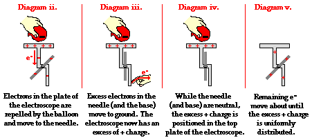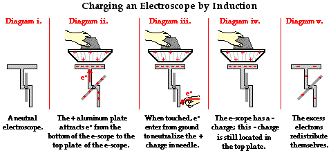 Suppose a needle electroscope is used to demonstrate induction charging. An aluminum pie plate is first charged positively by the process of induction (see discussion above). The aluminum plate is then held above the plate of the electroscope. Since the aluminum pie plate is not touched to the electroscope, the charge on the aluminum plate is NOT conducted to the electroscope. Nonetheless, the aluminum pie plate does have an affect upon the electrons in the electroscope. The pie plate induces electrons within the electroscope to move. Since opposites attract, a countless number of negatively charged electrons are drawn upwards towards the top of the electroscope. Having lost numerous electrons, the bottom of the electroscope has a temporarily induced positive charge. Having gained electrons, the top of the electroscope has a temporarily induced negative charge (Diagram ii. below). At this point the electroscope is polarized; however, the overall charge of the electroscope is neutral. The charging step then occurs as the bottom of the electroscope is touched to the ground. Upon touching the bottom of the electroscope, electrons enter the electroscope from the ground. One explanation of their entry is that they are drawn into the bottom of the electroscope by the presence of the positive charge at the bottom of the electroscope. Since opposites attract, electrons are drawn towards the bottom of the electroscope (Diagram iii.). As electrons enter, the needle of the electroscope is observed to return to the neutral position. This needle movement is the result of negative electrons neutralizing the previously positively charged needle at the bottom of the electroscope. At this point, the electroscope has an overall negative charge. The needle does not indicate this charge because the excess of electrons is still concentrated in the top plate of the electroscope; they are attracted to the positively charged aluminum pie plate that is held above the electroscope (Diagram iv.). Once the aluminum pie plate is pulled away, the excess of electrons in the electroscope redistribute themselves about the conducting parts of the electroscope. As they do, numerous excess electrons enter the needle and the base upon which the needle rests. The presence of excess negative charged in the needle and the base causes the needle to deflect, indicating that the electroscope has been charged (Diagram v.).