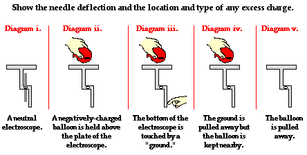 5. Suppose that a negatively charged balloon is used to charge an electroscope by induction. The procedural steps are described in the educational cartoon below. On the cartoon, draw the orientation of the needle and indicate the location and type of any excess charge in steps ii. - v. Explain in terms of electron movement what is happening in each step.