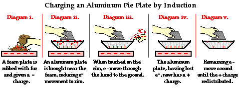 A commonly used lab activity that demonstrates the induction charging method is the Electrophorus Lab. In this lab, a flat plate of foam is rubbed with animal fur in order to impart a negative charge to the foam. Electrons are transferred from the animal fur to the more electron-loving foam (Diagram i.). An aluminum pie plate is taped to a Styrofoam cup; the aluminum is a conductor and the Styrofoam serves as an insulating handle. As the aluminum plate is brought near, electrons within the aluminum are repelled by the negatively charged foam plate. There is a mass migration of electrons to the rim of the aluminum pie plate. At this point, the aluminum pie plate is polarized, with the negative charge located along the upper rim farthest from the foam plate (Diagram ii.). The rim of the plate is then touched, providing a pathway from the aluminum plate to the ground. Electrons along the rim are not only repelled by the negative foam plate, they are also repelled by each other. So once touched, there is a mass migration of electrons from the rim to the person touching the rim (Diagram iii.). Being of much greater size than the aluminum pie plate, the person provides more space for the mutually repulsive electrons. The moment that electrons depart from the aluminum plate, the aluminum can be considered a charged object. Having lost electrons, the aluminum possesses more protons than electrons and is therefore positively charged. Once the foam plate is removed, the excess positive charge becomes distributed about the surface of the aluminum plate in order to minimize the overall repulsive forces between them (Diagram iv.).