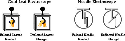 While there are different types of electroscopes, the basic operation of each is the same. The electroscope typically consists of a conducting plate or knob, a conducting base and either a pair of conducting leaves or a conducting needle. Since the operating parts of an electroscope are all conducting, electrons are capable of moving from the plate or knob on the top of the electroscope to the needle or leaves in the bottom of the electroscope. Objects are typically touched to or held nearby the plate or knob, thus inducing the movement of electrons into the needle or the leaves (or from the needle/leaves to the plate/knob). The gold leaves or needle of the electroscope are the only mobile parts. Once an excess of electrons (or a deficiency of electrons) is present in the needle or the gold leaves, there will be a repulsive affect between like charges causing the leaves to repel each other or the needle to be repelled by the base that it rests upon. Whenever this movement of the leaves/needle is observed, one can deduce that an excess of charge - either positive or negative - is present there. It is important to note that the movement of the leaves and needle never directly indicate the type of charge on the electroscope; it only indicates that the electroscope is detecting a charge.