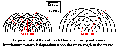 A two-point source interference pattern always has an alternating pattern of nodal and antinodal lines. There are however some features of the pattern that can be modified. First, a change in wavelength (or frequency) of the source will alter the number of lines in the pattern and alter the proximity or closeness of the lines. An increase in frequency will result in more lines per centimeter and a smaller distance between each consecutive line. And a decrease in frequency will result in fewer lines per centimeter and a greater distance between each consecutive line.