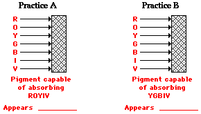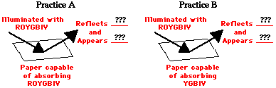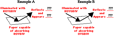 Consider the two diagrams below. The diagrams depict a sheet of paper being illuminated with white light (ROYGBIV). The papers are impregnated with a chemical capable of absorbing one or more of the colors of white light. Such chemicals that are capable of selectively absorbing one or more frequency of white light are known as pigments. In Example A, the pigment in the sheet of paper is capable of absorbing red, orange, yellow, blue, indigo and violet. In Example B, the pigment in the sheet of paper is capable of absorbing orange, yellow, green, blue, indigo and violet. In each case, whatever color is not absorbed is reflected.