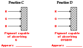 3. The diagrams depict a sheet of paper being illuminated with white light (ROYGBIV). The papers are impregnated with a chemical capable of absorbing one or more of the colors of white light. In each case, determine which color(s) of light are reflected by the paper and what color the paper will appear to an observer.