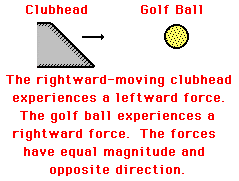 Consider the collision between the club head and the golf ball in the sport of golf. When the club head of a moving golf club collides with a golf ball at rest upon a tee, the force experienced by the club head is equal to the force experienced by the golf ball. Most observers of this collision have difficulty with this concept because they perceive the high speed given to the ball as the result of the collision. They are not observing unequal forces upon the ball and club head, but rather unequal accelerations. Both club head and ball experience equal forces, yet the ball experiences a greater acceleration due to its smaller mass. In a collision, there is a force on both objects that causes an acceleration of both objects. The forces are equal in magnitude and opposite in direction, yet the least massive object receives the greatest acceleration.