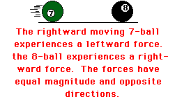 Consider the collision between a moving seven ball and an eight ball that is at rest in the sport of table pool. When the seven ball collides with the eight ball, each ball experiences an equal force directed in opposite directions. The rightward moving seven ball experiences a leftward force that causes it to slow down; the eight ball experiences a rightward force that causes it to speed up. Since the two balls have equal masses, they will also experience equal accelerations. In a collision, there is a force on both objects that causes an acceleration of both objects; the forces are equal in magnitude and opposite in direction. For collisions between equal-mass objects, each object experiences the same acceleration.
