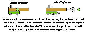 Momentum conservation is often demonstrated in a Physics class with a homemade cannon demonstration. A homemade cannon is placed upon a cart and loaded with a tennis ball. The cannon is equipped with a reaction chamber into which a small amount of fuel is inserted. The fuel is ignited, setting off an explosion that propels the tennis ball through the muzzle of the cannon. The impulse of the explosion changes the momentum of the tennis ball as it exits the muzzle at high speed. The cannon experienced the same impulse, changing its momentum from zero to a final value as it recoils backwards. Due to the relatively larger mass of the cannon, its backwards recoil speed is considerably less than the forward speed of the tennis ball.