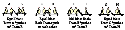 2. Students of varying mass are placed on large carts and deliver impulses to each other's carts, thus changing their momenta. In some cases, the carts are loaded with equal mass; in other cases they are unequal. In some cases, the students push off each other; in other cases, only one team does the pushing. For each situation, list the letter of the team that ends up with the greatest momentum. If they have the same momentum, then do not list a letter for that situation. Enter the four letters (or three or two or ...) in alphabetical order.