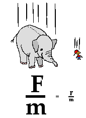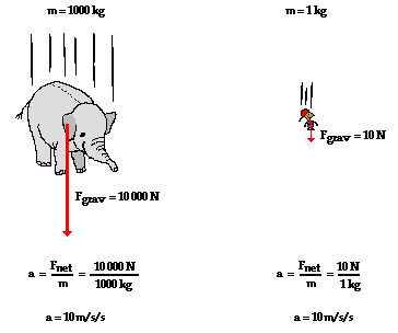 If Newton's second law were applied to their falling motion, and if a free-body diagram were constructed, then it would be seen that the 1000-kg baby elephant would experiences a greater force of gravity. This greater force of gravity would have a direct effect upon the elephant's acceleration; thus, based on force alone, it might be thought that the 1000-kg baby elephant would accelerate faster. But acceleration depends upon two factors: force and mass. The 1000-kg baby elephant obviously has more mass (or inertia). This increased mass has an inverse effect upon the elephant's acceleration. And thus, the direct effect of greater force on the 1000-kg elephant is offset by the inverse effect of the greater mass of the 1000-kg elephant; and so each object accelerates at the same rate - approximately 10 m/s/s. The ratio of force to mass (Fnet/m) is the same for the elephant and the mouse under situations involving free fall.