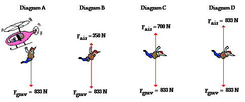 In the diagrams below, free-body diagrams showing the forces acting upon an 85-kg skydiver (equipment included) are shown. For each case, use the diagrams to determine the net force and acceleration of the skydiver at each instant in time. Then use the button to view the answers.
