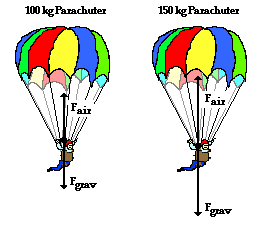 In situations in which there is air resistance, more massive objects fall faster than less massive objects. But why? To answer the why question, it is necessary to consider the free-body diagrams for objects of different mass. Consider the falling motion of two skydivers: one with a mass of 100 kg (skydiver plus parachute) and the other with a mass of 150 kg (skydiver plus parachute). The free-body diagrams are shown below for the instant in time in which they have reached terminal velocity.