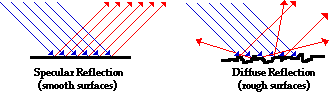 Reflection off of smooth surfaces such as mirrors or a calm body of water leads to a type of reflection known as specular reflection. Reflection off of rough surfaces such as clothing, paper, and the asphalt roadway leads to a type of reflection known as diffuse reflection. Whether the surface is microscopically rough or smooth has a tremendous impact upon the subsequent reflection of a beam of light. The diagram below depicts two beams of light incident upon a rough and a smooth surface.