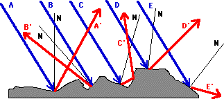For each type of reflection, each individual ray follows the law of reflection. However, the roughness of the material means that each individual ray meets a surface which has a different orientation. The normal line at the point of incidence is different for different rays. Subsequently, when the individual rays reflect off the rough surface according to the law of reflection, they scatter in different directions. The result is that the rays of light are incident upon the surface in a concentrated bundle and are diffused upon reflection. The diagram below depicts this principle. Five incident rays (labeled A, B, C, D, and E) approach a surface. The normal line (approximated) at each point of incidence is shown in black and labeled with an N. In each case, the law of reflection is followed, resulting in five reflected rays (labeled A,, B,, C,, D,, and E,).