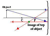 The theme of this unit has been that we see an object because light from the object travels to our eyes as we sight along a line at the object. Similarly, we see an image of an object because light from the object reflects off a mirror and travel to our eyes as we sight at the image location of the object. From these two basic premises, we have defined the image location as the location in space where light appears to diverge from. Ray diagrams have been a valuable tool for determining the path taken by light from the object to the mirror to our eyes. In this section of Lesson 3, we will investigate the method for drawing ray diagrams for objects placed at various locations in front of a concave mirror.