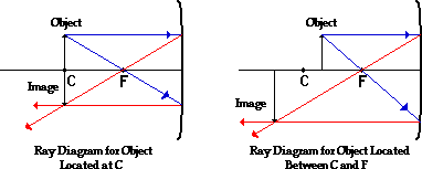 Once the method of drawing ray diagrams is practiced a couple of times, it becomes as natural as breathing. Each diagram yields specific information about the image. The two diagrams below show how to determine image location, size, orientation and type for situations in which the object is located at the center of curvature and when the object is located between the center of curvature and the focal point.