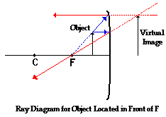 A ray diagram for the case in which the object is located in front of the focal point is shown in the diagram at the right. Observe that in this case the light rays diverge after reflecting off the mirror. When light rays diverge after reflection, a virtual image is formed. As was done with plane mirrors, the image location can be found by tracing all reflected rays backwards until they intersect. For every observer, the reflected rays would seem to be diverging from this point. Thus, the point of intersection of the extended reflected rays is the image point. Since light does not actually pass through this point (light never travels behind the mirror), the image is referred to as a virtual image. Observe that when the object in located in front of the focal point, its image is an upright and enlarged image that is located on the other side of the mirror. In fact, one generalization that can be made about all virtual images produced by mirrors (both plane and curved) is that they are always upright and always located on the other side of the mirror.