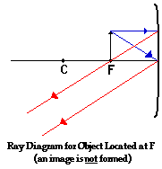 For the case of the object located at the focal point (F), the light rays neither converge nor diverge after reflecting off the mirror. As shown in the diagram above, the reflected rays are traveling parallel to each other. Subsequently, the light rays will not converge on the object's side of the mirror to form a real image; nor can they be extended backwards on the opposite side of the mirror to intersect to form a virtual image. So how should the results of the ray diagram be interpreted? The answer: there is no image!! Surprisingly, when the object is located at the focal point, there is no location in space at which an observer can sight from which all the reflected rays appear to be diverging. An image is not formed when the object is located at the focal point of a concave mirror.