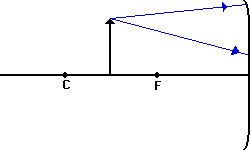 Thus far we have seen via ray diagrams that a real image is produced when an object is located more than one focal length from a concave mirror; and a virtual image is formed when an object is located less than one focal length from a concave mirror (i.e., in front of F). But what happens when the object is located at F? That is, what type of image is formed when the object is located exactly one focal length from a concave mirror? Of course a ray diagram is always one tool to help find the answer to such a question. However, when a ray diagram is used for this case, an immediate difficulty is encountered. The incident ray that begins from the top extremity of the object and passes through the focal point does not meet the mirror. Thus, a different incident ray must be used in order to determine the intersection point of all reflected rays. Any incident light ray would work as long as it meets up with the mirror. Recall that the only reason that we have used the two we have is that they can be conveniently and easily drawn. The diagram below shows two incident rays and their corresponding reflected rays.