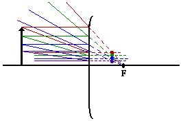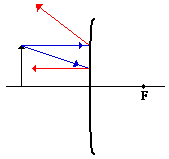 The ray that travels towards the focal point will reflect and travel parallel to the principal axis. Use a straight edge to accurately draw its path. The ray that traveled parallel to the principal axis on the way to the mirror will reflect and travel in a direction such that its extension passes through the focal point. Align a straight edge with the point of incidence and the focal point, and draw the second reflected ray. Place arrowheads upon the rays to indicate their direction of travel. The two rays should be diverging upon reflection.