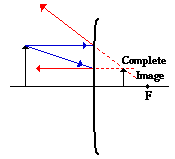 Some students have difficulty understanding how the entire image of an object can be deduced once a single point on the image has been determined. If the object is merely a vertical object (such as the arrow object used in the example below), then the process is easy. The image is merely a vertical line. This is illustrated in the diagram below. In theory, it would be necessary to pick each point on the object and draw a separate ray diagram to determine the location of the image of that point. That would require a lot of ray diagrams as illustrated in the diagram below.