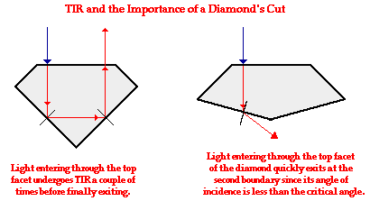 Relatively speaking, the critical angle for the diamond-air boundary is an extremely small number. Of all the possible combinations of materials that could interface to form a boundary, the combination of diamond and air provides one of the largest differences in the index of refraction values. This means that there will be a very small nr/ni ratio and subsequently a small critical angle. This peculiarity about the diamond-air boundary plays an important role in the brilliance of a diamond gemstone. Having a small critical angle, light has the tendency to become "trapped" inside of a diamond once it enters. A light ray will typically undergo TIR several times before finally refracting out of the diamond. Because the diamond-air boundary has such a small critical angle (due to diamond's large index of refraction), most rays approach the diamond at angles of incidence greater than the critical angle. This gives diamond a tendency to sparkle. The effect can be enhanced by the cutting of a diamond gemstone with a strategically planned shape. The diagram below depicts the total internal reflection within a diamond gemstone with a strategic and a non-strategic cut.