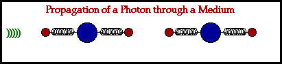 Earlier in this unit, the concept of optical density was introduced. Different materials are distinguished from each other by their different optical densities. The optical density is simply a measure of the tendency of a material to slow down light as it travels through it. As mentioned earlier, a light wave traveling through a transparent material interacts with the atoms of that material. When a light wave impinges upon an atom of the material, it is absorbed by that atom. The absorbed energy causes the electrons in the atom to vibrate. If the frequency of the light wave does not match the resonance frequency of the vibrating electrons, then the light will be reemitted by the atom at the same frequency at which it impinged upon it. The light wave then travels through the interatomic vacuum towards the next atom of the material. Once it impinges upon the next atom, the process of absorption and re-emission is repeated.