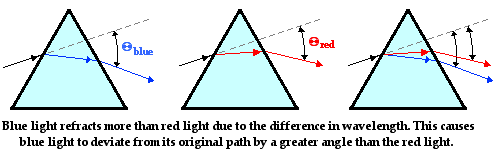 (and wavelengths) that causes the dispersion of light by a triangular prism. Violet light, being slowed down to a greater extent by the absorption and re-emission process, refracts more than red light. Upon entry of white light at the first boundary of a triangular prism, there will be a slight separation of the white light into the component colors of the spectrum. Upon exiting the triangular prism at the second boundary, the separation becomes even greater and ROYGBIV is observed in its splendor.