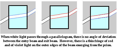 Suppose that a flashlight could be covered with black paper with a slit across it so as to create a beam of white light. And suppose that the beam of white light with its component colors unseparated were directed at an angle towards the surface of a rectangular glass prism. As would be expected, the light would refract towards the normal upon entering the glass and away from the normal upon exiting the glass. But since the violet light has a shorter wavelength, it would refract more than the longer wavelength red light. The refraction of light at the entry location into the rectangular glass prism would cause a little separation of the white light. However, upon exiting the glass prism, the refraction takes place in the opposite direction. The light refracts away from the normal, with the violet light bending a bit more than the red light. Unlike the passage through the triangular prism with non-parallel sides, there is no overall angle of deviation for the various colors of white light. Both the red and the violet components of light are traveling in the same direction as they were traveling before entry into the prism. There is however a thin red fringe present on one end of the beam and thin violet fringe present on the opposite side of the beam. This fringe is evidence of dispersion. Because there is a different angle of deviation of the various components of white light after transmission across the first boundary, the violet is separated ever so slightly from the red. Upon transmission across the second boundary, the direction of refraction is reversed; yet because the violet light has traveled further downward when passing through the rectangle it is the primary color present in the lower edge of the beam. The same can be said for red light on the upper edge of the beam.