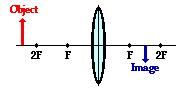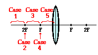Previously in Lesson 5, ray diagrams were constructed in order to determine the general location, size, orientation, and type of image formed by double convex lenses. Perhaps you noticed that there is a definite relationship between the image characteristics and the location where an object placed in front of a double convex lens. The purpose of this portion of the lesson is to summarize these object-image relationships. The best means of summarizing this relationship is to divide the possible object locations into five general areas or points: