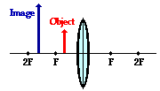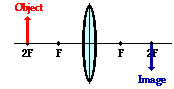 When the object is located in front of the 2F point, the image will be located beyond the 2F point on the other side of the lens. Regardless of exactly where the object is located between 2F and F, the image will be located in the specified region. In this case, the image will be inverted (i.e., a right side up object results in an upside-down image). The image dimensions are larger than the object dimensions. A six-foot tall person would have an image that is larger than six feet tall. The absolute value of the magnification is greater than 1. Finally, the image is a real image. Light rays actually converge at the image location. As such, the image of the object could be projected upon a sheet of paper.