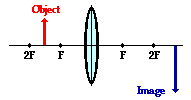 When the object is located at the 2F point, the image will also be located at the 2F point on the other side of the lens. In this case, the image will be inverted (i.e., a right side up object results in an upside-down image). The image dimensions are equal to the object dimensions. A six-foot tall person would have an image that is six feet tall; the absolute value of the magnification is exactly 1. Finally, the image is a real image. Light rays actually converge at the image location. As such, the image of the object could be projected upon a sheet of paper.