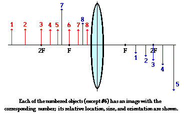 It might be noted from the above descriptions that there is a relationship between the object distance and object size and the image distance and image size. Starting from a large value, as the object distance decreases (i.e., the object is moved closer to the lens), the image distance increases; meanwhile, the image height increases. At the 2F point, the object distance equals the image distance and the object height equals the image height. As the object distance approaches one focal length, the image distance and image height approaches infinity. Finally, when the object distance is equal to exactly one focal length, there is no image. Then altering the object distance to values less than one focal length produces images that are upright, virtual and located on the same side of the lens as the object. Finally, if the object distance approaches 0, the image distance approaches 0 and the image height ultimately becomes equal to the object height. These patterns are depicted in the diagram below. Eight different object locations are drawn in red and labeled with a number; the corresponding image locations are drawn in blue and labeled with the identical number.