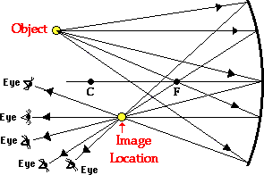 We have also seen how images are created by the reflection of light off curved mirrors. Suppose that a light bulb is placed in front of a concave mirror; the light bulb will emit light in a variety of directions, some of which will strike the mirror. Each individual ray of light will reflect according to the law of reflection. Upon reflecting, the light will converge at a point. At the point where the light from the object converges, a replica or likeness of the actual object is created; this replica is known as the image. Once the reflected light rays reached the image location, they begin to diverge. The point where all the reflected light rays converge is known as the image point. Not only is it the point where light rays converge, it is also the point where reflected light rays appear to an observer to be coming from. Regardless of the observer's location, the observer will see a ray of light passing through the real image location. To view the image, the observer must line her sight up with the image location in order to see the image via the reflected light ray. The diagram below depicts several rays from the object reflecting from the mirror and converging at the image location. The reflected light rays then begin to diverge, with each one being capable of assisting an individual in viewing the image of the object.