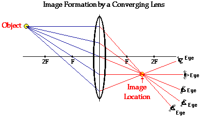 Converging lenses can produce both real and virtual images while diverging lenses can only produce virtual images. The process by which images are formed for lenses is the same as the process by which images are formed for plane and curved mirrors. Images are formed at locations where any observer is sighting as they view the image of the object through the lens. So if the path of several light rays through a lens is traced, each of these light rays will intersect at a point upon refraction through the lens. Each observer must sight in the direction of this point in order to view the image of the object. While different observers will sight along different lines of sight, each line of sight intersects at the image location. The diagram below shows several incident rays emanating from an object - a light bulb. Three of these incident rays correspond to our three strategic and predictable light rays. Each incident ray will refract through the lens and be detected by a different observer (represented by the eyes). The location where the refracted rays are intersecting is the image location.