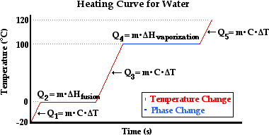 The discussion above and the accompanying equation (Q = m•C•∆T) relates the heat gained or lost by an object to the resulting temperature changes of that object. As we have learned, sometimes heat is gained or lost but there is no temperature change. This is the case when the substance is undergoing a state change. So now we must investigate the mathematics related to changes in state and the quantity of heat.