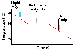 But does the absorption or release of energy in the form of heat always cause a temperature change? Surprisingly, the answer is no. To illustrate why, consider the following situation, which is often demonstrated or even experimented with in a thermal physics unit in school. Para-dichlorobenzene, the main ingredient in many forms of mothballs, has a melting point of about 54 °C. Suppose that a sample of the chemical is collected in a test tube and heated to about 80°C. The para-dichlorobenzene will be in the liquid state (though much of it will have sublimed and be filling the room with a most noticeable aroma). Now suppose that a thermometer is inserted in the test tube and that the test tube is placed in a beaker of room temperature water. Temperature-time data can be collected every 10 seconds. Quite expectedly, one notices that the temperature of the para-dichlorobenzene gradually decreases. As heat is transferred from the high temperature test tube to the low temperature water, the temperature of the liquid para-dichlorbenzene decreases. But then quite unexpectedly, one would notice that this steady decrease in temperature ceases at about 54°C. Once the temperature of liquid para-dichlorbenzene decreases to 54°C, the thermometer level suddenly stands still. Based on the thermometer reading, you might think that no heat was being transferred. But a look in the test tube reveals dramatic change taking place. The liquid para-dichlorbenzene is crystallizing to form solid para-dichlorbenzene. Once the last trace of liquid para-dichlorbenzene vanishes (and it is in all solid form), the temperature begins to decrease again from 54°C to the temperature of the water. How can these observations help us to understand the question of what does heat do?