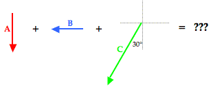 To assist in the discussion, the three vectors have been labeled as vectors A, B, and C. The resultant is the vector sum of these three vectors; a head-to-tail vector addition diagram reveals that the resultant is directed southwest. Of the three vectors being added, vector C is clearly the nasty vector. Its direction is neither due south nor due west. The solution involves resolving this vector into its components.