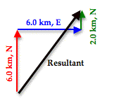 As can be seen in the diagram, the resultant vector (drawn in black) is not the hypotenuse of any right triangle - at least not of any immediately obvious right triangle. But would it be possible to force this resultant vector to be the hypotenuse of a right triangle? The answer is Yes! To do so, the order in which the three vectors are added must be changed. The vectors above were drawn in the order in which they were driven. The student drove north, then east, and then north again. But if the three vectors are added in the order 6.0 km, N + 2.0 km, N + 6.0 km, E, then the diagram will look like this: