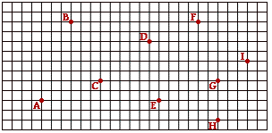 Consider the diagram below. Nine unique, labeled locations are provided on a grid. Each square on the grid represents a 20-meter x 20-meter area. Rightward on the grid is in the eastward direction and upward on the grid in the northward direction. Use the grid in answering the next few questions.