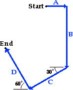 6. Mia Ander exits the front door of her home and walks along the path shown in the diagram at the right (not to scale). The walk consists of four legs with the following magnitudes: