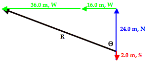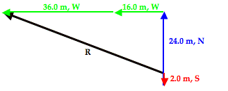 The resultant vector (drawn in black and labeled R) in the vector addition diagram above is not the hypotenuse of any immediately obvious right trangle. But by changing the order of addition of these four vectors, one can force this resultant vector to be the hypotenuse of a right triangle. For instance, by adding the vectors in the order of 2.0 m, S + 24.0 m, N + 16.0 m, W + 36.0 m. W, the resultant becomes the hypotenuse of a right triangle. This is shown in the vector addition diagram below.