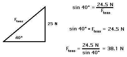 As another example that illustrates this idea, consider the symmetrical hanging of a sign as shown at the right. If the sign is known to have a mass of 5 kg and if the angle between the two cables is 100 degrees, then the tension in the cable can be determined. Assuming that the sign is at equilibrium (a good assumption if it is remaining at rest), the two cables must supply enough upward force to balance the downward force of gravity. The force of gravity (also known as weight) is 49 N (Fgrav = m*g), so each of the two cables must pull upwards with 24.5 N of force. Since the angle between the cables is 100 degrees, then each cable must make a 50-degree angle with the vertical and a 40-degree angle with the horizontal. A sketch of this situation (see diagram below) reveals that the tension in the cable can be found using the sine function. The triangle below illustrates these relationships.