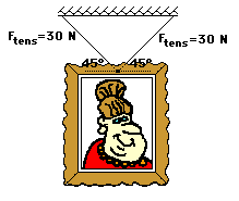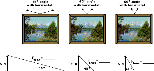 There is an important principle that emanates from some of the trigonometric calculations performed above. The principle is that as the angle with the horizontal increases, the amount of tensional force required to hold the sign at equilibrium decreases. To illustrate this, consider a 10-Newton picture held by three different wire orientations as shown in the diagrams below. In each case, two wires are used to support the picture; each wire must support one-half of the sign's weight (5 N). The angle that the wires make with the horizontal is varied from 60 degrees to 15 degrees. Use this information and the diagram below to determine the tension in the wire for each orientation. When finished, click the button to view the answers.