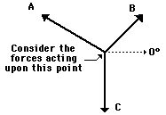 The data in the table above show that the forces nearly balance. An analysis of the horizontal components shows that the leftward component of A nearly balances the rightward component of B. An analysis of the vertical components show that the sum of the upward components of A + B nearly balance the downward component of C. The vector sum of all the forces is (nearly) equal to 0 Newton. But what about the 0.1 N difference between rightward and leftward forces and the 0.2 N difference between the upward and downward forces? Why do the components of force only nearly balance? The sample data used in this analysis are the result of measured data from an actual experimental setup. The difference between the actual results and the expected results is due to the error incurred when measuring force A and force B. We would have to conclude that this low margin of experimental error reflects an experiment with excellent results. We could say it's "close enough for government work."