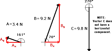 Another way of determining the net force (vector sum of all the forces) involves using the trigonometric functions to resolve each force into its horizontal and vertical components. Once the components are known, they can be compared to see if the vertical forces are balanced and if the horizontal forces are balanced. The diagram below shows vectors A, B, and C and their respective components. For vectors A and B, the vertical components can be determined using the sine of the angle and the horizontal components can be analyzed using the cosine of the angle. The magnitude and direction of each component for the sample data are shown in the table below the diagram.