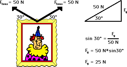 Suppose the tension in both of the cables is measured to be 50 N and that the angle that each cable makes with the horizontal is known to be 30 degrees. What is the weight of the sign? This question can be answered by conducting a force analysis using trigonometric functions. The weight of the sign is equal to the sum of the upward components of the tension in the two cables. Thus, a trigonometric function can be used to determine this vertical component. A diagram and accompanying work is shown below.
