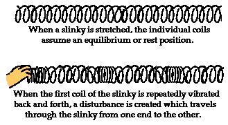 A wave can be described as a disturbance that travels through a medium from one location to another location. Consider a slinky wave as an example of a wave. When the slinky is stretched from end to end and is held at rest, it assumes a natural position known as the equilibrium or rest position. The coils of the slinky naturally assume this position, spaced equally far apart. To introduce a wave into the slinky, the first particle is displaced or moved from its equilibrium or rest position. The particle might be moved upwards or downwards, forwards or backwards; but once moved, it is returned to its original equilibrium or rest position. The act of moving the first coil of the slinky in a given direction and then returning it to its equilibrium position creates a disturbance in the slinky. We can then observe this disturbance moving through the slinky from one end to the other. If the first coil of the slinky is given a single back-and-forth vibration, then we call the observed motion of the disturbance through the slinky a slinky pulse. A pulse is a single disturbance moving through a medium from one location to another location. However, if the first coil of the slinky is continuously and periodically vibrated in a back-and-forth manner, we would observe a repeating disturbance moving within the slinky that endures over some prolonged period of time. The repeating and periodic disturbance that moves through a medium from one location to another is referred to as a wave.