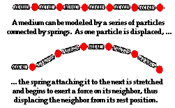 coil will displace the second coil from its equilibrium position. As the second coil becomes displaced, it begins to push or pull on the third coil; the push or pull on the third coil displaces it from its equilibrium position. As the third coil becomes displaced, it begins to push or pull on the fourth coil. This process continues in consecutive fashion, with each individual particle acting to displace the adjacent particle. Subsequently, the disturbance travels through the medium. The medium can be pictured as a series of particles connected by springs. As one particle moves, the spring connecting it to the next particle begins to stretch and apply a force to its adjacent neighbor. As this neighbor begins to move, the spring attaching this neighbor to its neighbor begins to stretch and apply a force on its adjacent neighbor.