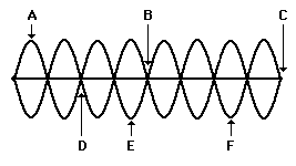 The positioning of the nodes and antinodes in a standing wave pattern can be explained by focusing on the interference of the two waves. The nodes are produced at locations where destructive interference occurs. For instance, nodes form at locations where a crest of one wave meets a trough of a second wave; or a half-crest of one wave meets a half-trough of a second wave; or a quarter-crest of one wave meets a quarter-trough of a second wave; etc. Antinodes, on the other hand, are produced at locations where constructive interference occurs. For instance, if a crest of one wave meets a crest of a second wave, a point of large positive displacement results. Similarly, if a trough of one wave meets a trough of a second wave, a point of large negative displacement results. Antinodes are always vibrating back and forth between these points of large positive and large negative displacement; this is because during a complete cycle of vibration, a crest will meet a crest; and then one-half cycle later, a trough will meet a trough. Because antinodes are vibrating back and forth between a large positive and large negative displacement, a diagram of a standing wave is sometimes depicted by drawing the shape of the medium at an instant in time and at an instant one-half vibrational cycle later. This is done in the diagram below.