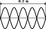 5. The string at the right is 8.2 meters long and is vibrating as the fifth harmonic. The string vibrates up and down with 21 complete vibrational cycles in 5 seconds. Determine the frequency, period, wavelength and speed for this wave.